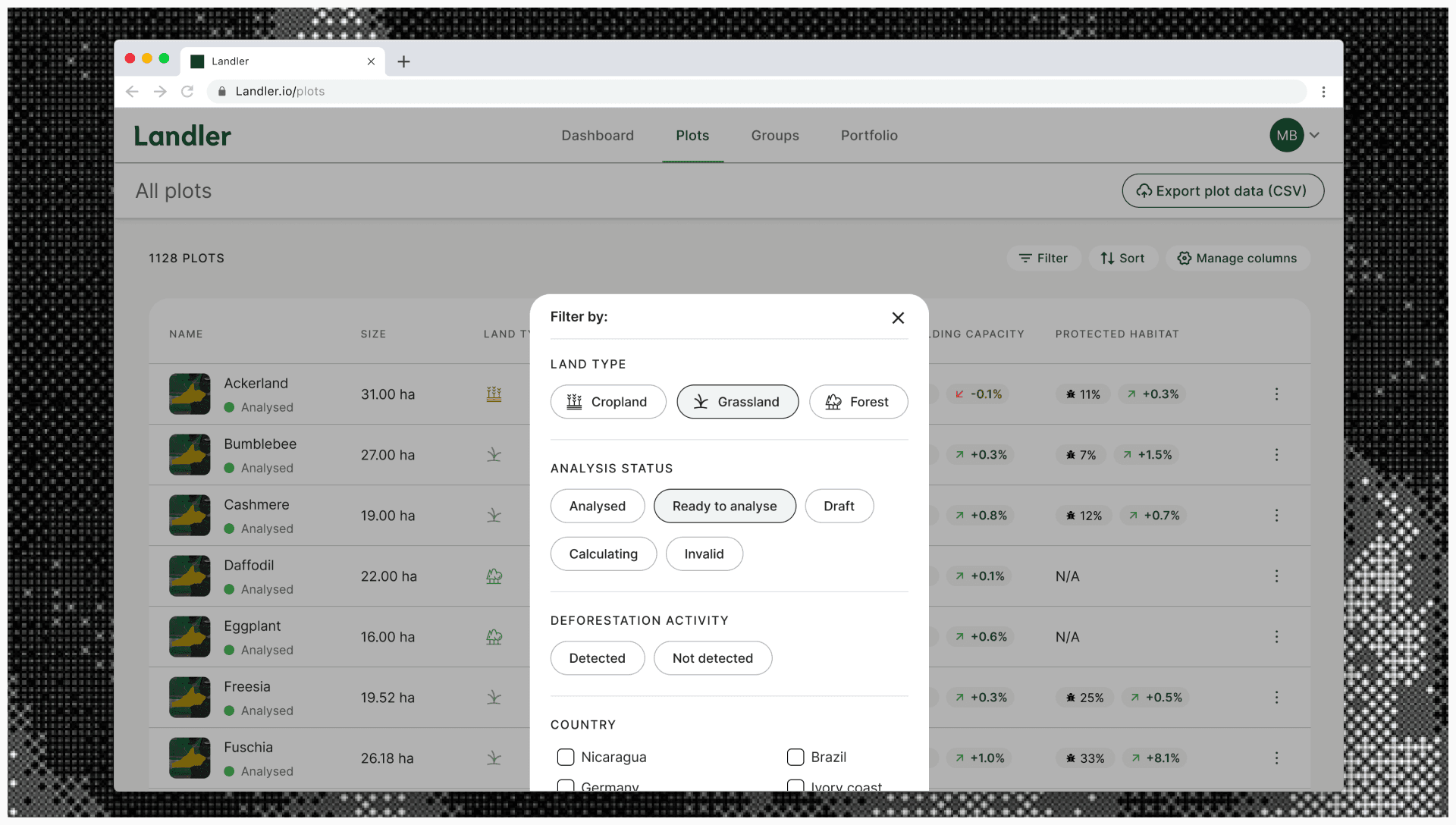Landler is a web-based financial platform by The Landbanking Group that supports sustainable land use by facilitating nature-positive investments and providing integrated sustainability reporting across multiple global frameworks.